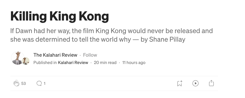 Published in 2023 in The Kalahari Review, this is the story of a woman's attempt to ban the movie King Kong.